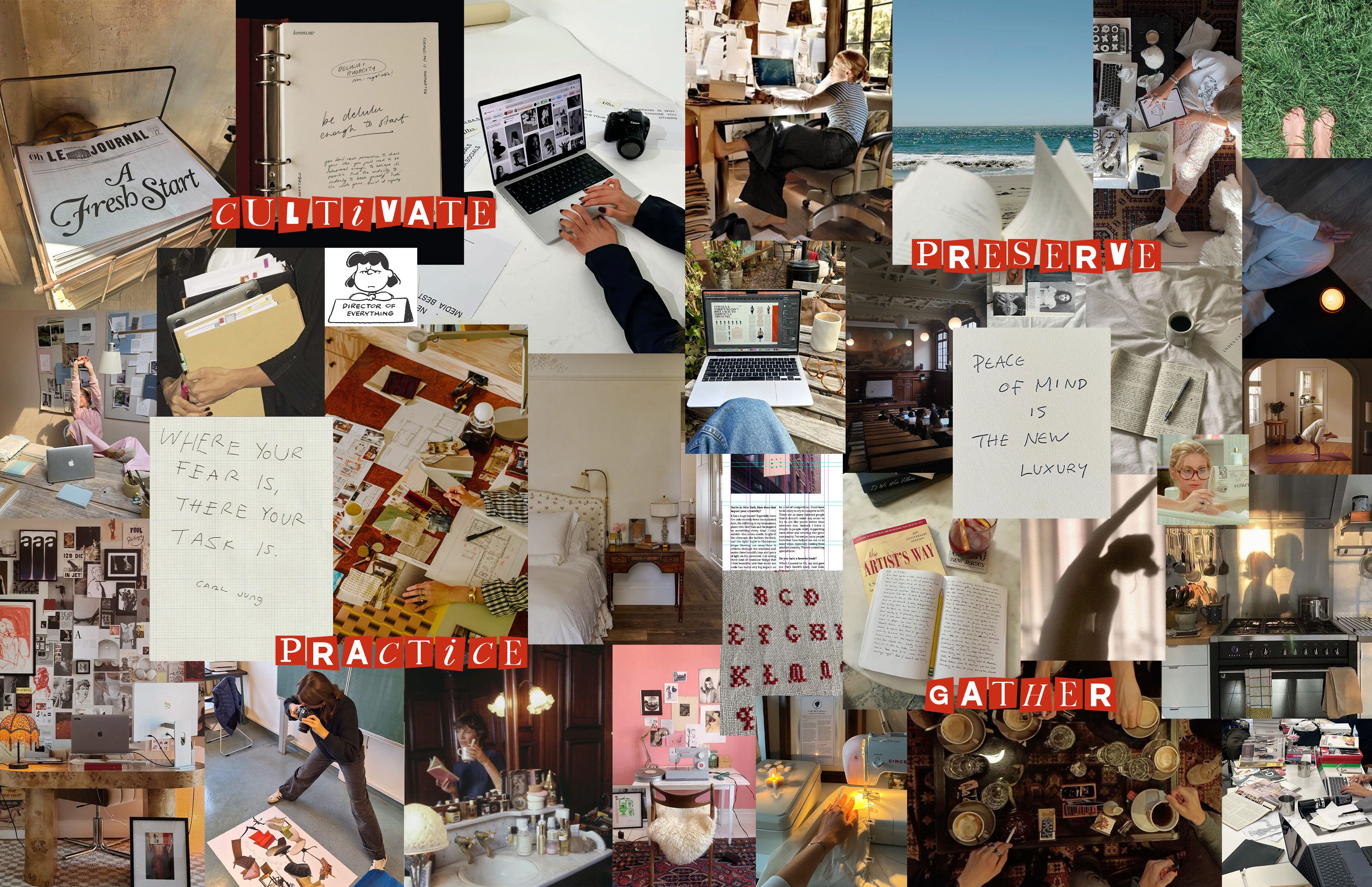 For 2026, I’m shifting my focus a bit. I chose cultivate, practice, gather, and preserve as my intentions for the upcoming year. I have a list of specific personal goals, of course, but when putting together the vision board, I like to set spaces for each word and fill them with photos, quotes, and other inspiring bits to help me visualize the year I’d like to have.